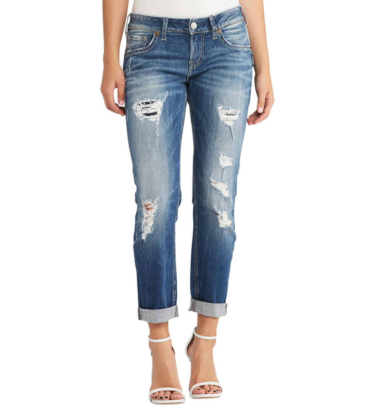 The essential boyfriend jean, Sam features a mid rise and slouchy, relaxed fit. It's designed with super-stretch denim that's lightweight and incredibly comfortable. This pair is washed to a medium indigo shade with hand sanding, whisker patterns and destroyed details. Finished with a slim leg, cuffed hem and stitching on the back pockets.
